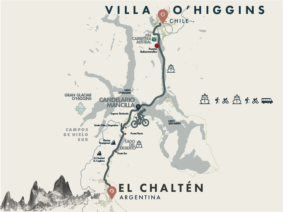 Cruce Paso Dos Lagunas – Navegación Lago O’Higgins, pedaleo entre Candelario Mansilla y Lago del Desierto, llegada a El Chaltén.